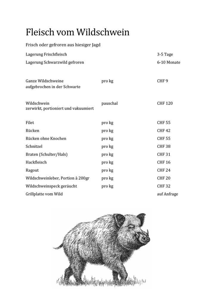 Wir bieten regionale und natürliche Produkte von Tieren aus eigner Jagd im Kanton Zürich an. Das Fleisch wird von ausgewiesenen Fachleuten zerwirkt, abgepackt und vakuumiert. Durch die unmittelbare Nähe zu den Jagdrevieren "Mörsburg" und "Elgg" können wir von sehr kurzen Verarbeitungs- und Transportwegen profitieren.